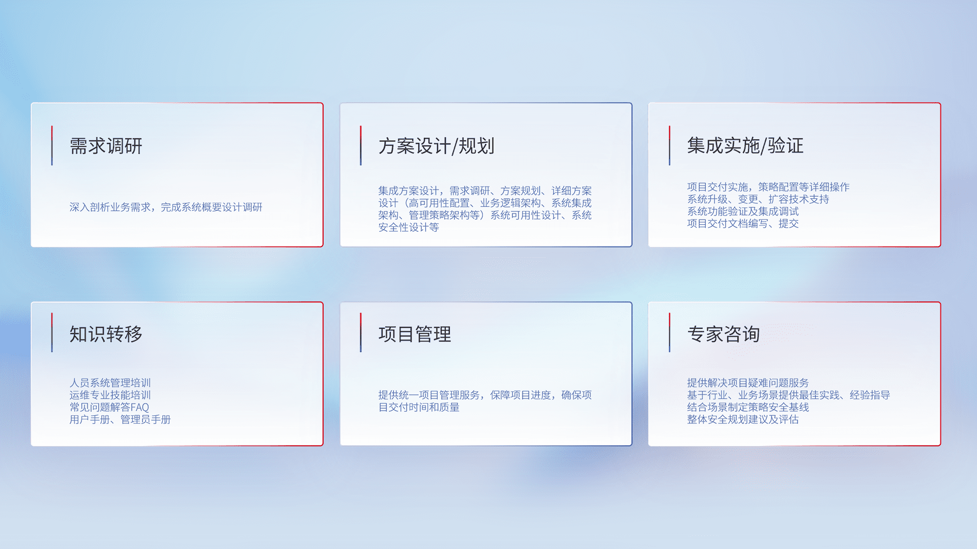 针对客户行业特性,,,,将宏观的安全战略和需求,,,通过专业的交付服务,,实现项目落地,,,为客户提供标准规范的集成交付服务。。。
